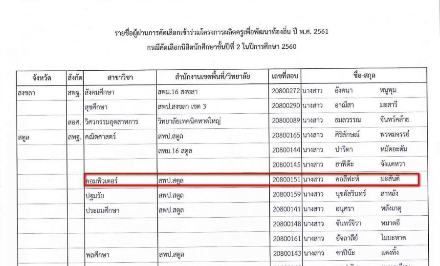นางสาวคอลีฟะห์ มะสันติ นักศึกษาหลักสูตรคอมพิวเตอร์ศึกษา (ค.บ) ชั้นปีที่ 3 ผ่านการคัดเลือกในโครงการผลิตครูเพื่อพัฒนาท้องถิ่นประจำปี 2561
