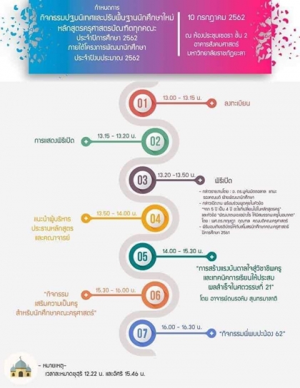 ประชาสัมพันธ์ ไปยังน้องๆนักศึกษาชั้นปีที่ 1 (รหัส 62) ขอเชิญเข้าร่วมกิจกรรม "ปฐมนิเทศและปรับพื้นฐานนักศึกษาใหม่ หลักสูตรครุศาสตรบัณฑิตทุกคณะ ประจำปีการศึกษา 2562" ในวันที่ 10 กรกฎาคม 2562 เวลา 13.00 - 16.30 น. ณ ห้องประชุมเชอรา ชั้น 2 อาคารสังคมศาสตร์ มหาวิทยาลัยราชภัฏยะลา รายละเอียดดังเอกสารแนบ เนื่องด้วยกิจกรรมดังกล่าวชนกับกิจกรรมปฐมนิเทศนักศึกษาใหม่ของคณะวิทยาศาสตร์เทคโนโลยีและการเกษตร ดังนั้นขอให้นักศึกษาทุกคนเข้าร่วมกิจกรรมของคณะครุศาสตร์ ตามวันเวลา และสถานที่ดังกล่าว