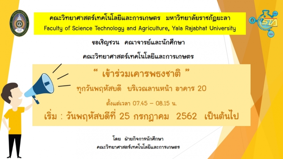 ขอเชิญชวนอาจารย์ นักศึกษา คณะวิทยาศาสตร์เทคโนโลยีและการเกษตร เข้าร่วมเคารพธงชาติ ทุกวันพฤหัสบดี บริเวณลานหน้า อาคาร 20 ตั้งแต่เวลา 07.45 - 08.15 น. เริ่มวันพฤหัสบดีที่ 25 กรกฎาคม 2562 เป็นต้นไป