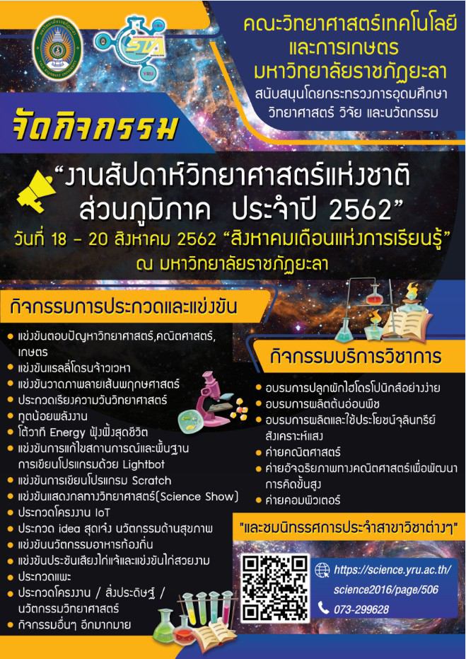ขอเชิญทุกท่านเข้าร่วม ''งานสัปดาห์วิทยาศาสตร์แห่งชาติส่วนภูมิภาค ประจำปี 2562" ระหว่างวันที่ 18 - 20 สิงหาคม 2562 "สิงหาคมเดือนแห่งการเรียนรู้" ณ มหาวิทยาลัยราชภัฏยะลา สนับสนุนโดยกระทรวงการอุดมศึกษาวิทยาศาสตร์ วิจัย และนวัตกรรม และเตรียมพบกับนิทรรศกาลประจำสาขาวิชาต่างๆ การประกวดแข่งขัน การแสดง พร้อมกับเยี่ยมชม และลิ้มลองอาหารตามบูธต่างๆ อีกมากมาย ติดต่อสอบถามเพิ่มเติมได้ตามโปสเตอร์ และอ่านรายละเอียดเพิ่มเติมตามลิงค์ข้างล่างนี้เลยค่ะ