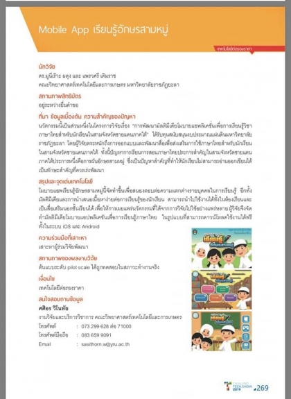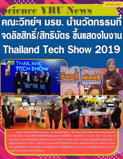 เมื่อวันที่ 5-6 กันยายน 2562 อาจารย์ ดร.มูนีเร๊าะ ผดุง ประธานหลักสูตรคอมพิวเตอร์ศึกษา คณะวิทยาศาสตร์เทคโนโลยีและการเกษตร มหาวิทยาลัยราชภัฏยะลา ได้รับเชิญจากสำนักงานพัฒนาวิทยาศาสตร์และเทคโนโลยีแห่งชาติ (สวทช.) นำผลงานที่มีการจดลิขสิทธิ์หรืออยู่ในกระกวนการจดสิทธิบัตร ร่วมแสดงในงาน Thailand Tech Show 2019 ณ โรงแรมเซนทาราแกรนด์ เซ็นทรัลเวิลด์ กรุงเทพมหานคร ในผลงาน Mobile App เรียนรู้อักษรสามหมู่ ซึ่งจัดทำขึ้นเพื่อสนองต่อความแตกต่างของรายบุคคลในการเรียนรู้ อีกทั้งมัลติมีเดียและการนำเสนอเนื้อหาง่ายต่อการเรียนรู้ของนักเรียน สามารถนำไปใช้งานได้ทั้งในห้องเรียนและเป็นสื่อเสริมนอกชั้นเรียนได้