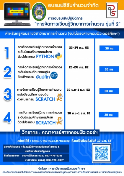 กิจกรรมพัฒนาศักยภาพครูคอมพิวเตอร์ที่สอนไม่ตรงสาระ ภายใต้โครงการส่งเสริมและเผยแพร่ความจริงที่ถูกต้องเพื่อสนับสนุนการแก้ไขปัญหา กำหนดจัดอบรมวิทยาการคำนวณ 4 หลักสูตร ตามนี้นะคะ