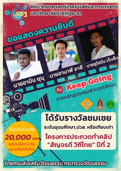 #ขอแสดงความยินดีกับ นายอามีน ยุนุ นายฮานาฟี อาลี และนายซูไฮมีน เจ็ะเซ็ง ในนามทีม "Keep Going" นักศึกษาหลักสูตรครุศาสตรบัณฑิต สาขาวิชาคอมพิวเตอร์ศึกษา ที่ได้รับรางวัลชมเชย ระดับอุดมศึกษา,ปวส. หรือเทียบเท่า ในโครงการประกวดทำคลิป “สัญจรดี วิถีไทย” ปีที่ 2 โดยกรมส่งเสริมวัฒนธรรม กระทรวงวัฒนธรรม