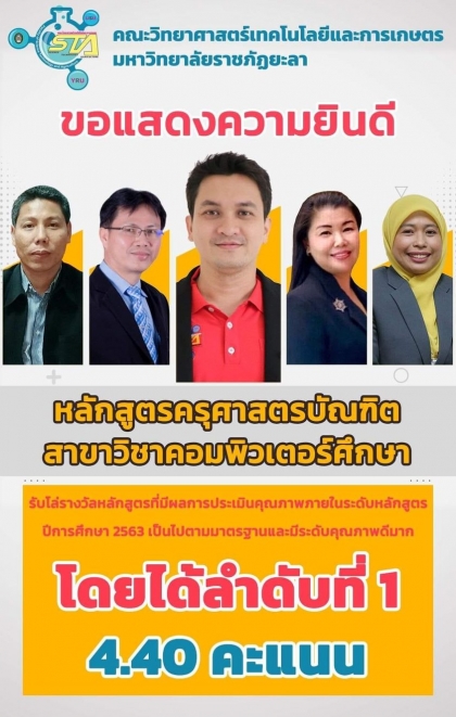 หลักสูตรครุศาสตรบัณฑิต สาขาวิชาคอมพิวเตอร์ศึกษา คณะวิทยาศาสตร์เทคโนโลยีและการเกษตร มหาวิทยาลัยราชภัฏยะลา ได้รับโล่รางวัลหลักสูตรที่มีผลการประเมินคุณภาพภายในระดับหลักสูตร ประจำปีการศึกษา 2563 เป็นไปตามมาตรฐานและมีระดับคุณภาพดีมาก โดยได้ลำดับที่ 1 ด้วยคะแนน 4.40