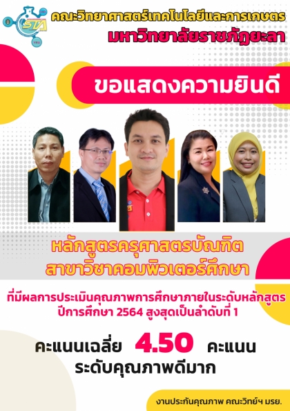 หลักสูตรครุศาสตรบัณฑิต สาขาวิชาคอมพิวเตอร์ศึกษา ที่มีผลการประเมินคุณภาพการศึกษาภายในระดับหลักสูตร ปีการศึกษา 2564 สูงสุดเป็นลำดับที่ 1️ คะแนนเฉลี่ย 4.50 คะแนน ระดับคุณภาพดีมาก