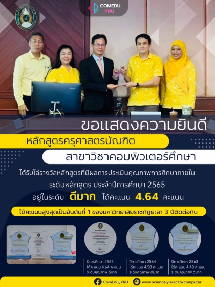 ขอแสดงความยินดีกับ หลักสูตรครุศาสตรบัณฑิต สาขาวิชาคอมพิวเตอร์ศึกษา ที่ได้รับโล่รางวัลหลักสูตรที่มีผลการประเมินคุณภาพการศึกษาภายใน ระดับหลักสูตร ประจำปีการศึกษา 2565 ที่อยู่ในระดับคุณภาพดีมาก 3 ปีซ้อน ความสำเร็จนี้คงไม่เกิดขึ้น หากขาดบุคลากร อาจารย์ เจ้าหน้าที่ ที่คอยขับเคลื่อนหลักสูตร รวมถึงนักศึกษาทุกคนที่ให้ความร่วมมือ และมีส่วนร่วมในการสร้างชื่อเสียงให้กับทางหลักสูตรอย่างต่อเนื่อง