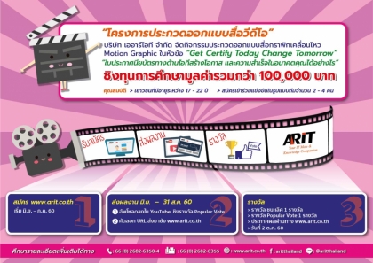 บริษัท เออาร์ไอที จำกัด เป็นผู้นำทางด้านการอบรม และสร้างมาตรฐานไอทีระดับสากลในประเทศไทย จัดกิจกรรมประกวดออกแบบสื่อวีดีโอ กราฟิกเคลื่อนไหว  (Motion Graphic)   เพื่อค้นหาตัวแทนที่มีความสามารถในการสร้างสรรค์ผลงานวีดีโอที่สามารถใช้สำหรับประชาสัมพันธ์ และเผยแพร่ออกสู่ตลาดธุรกิจได้อย่างแท้จริง ภายใต้หัวข้อ  “ Get Certify Today Change Tomorrow.” ชิงทุนการศึกษามูลค่ารวมกว่า 100,000 บาทโดยผู้สนใจเข้าร่วมประกวดผลงาน สมัครเข้าแข่งขันในรูปแบบทีม จำนวน 2-4 คน  มีอายุระหว่าง 17 -22 ปี    ร่วมผลิตสื่อวีดีโอความยาวไม่เกิน 3 นาที